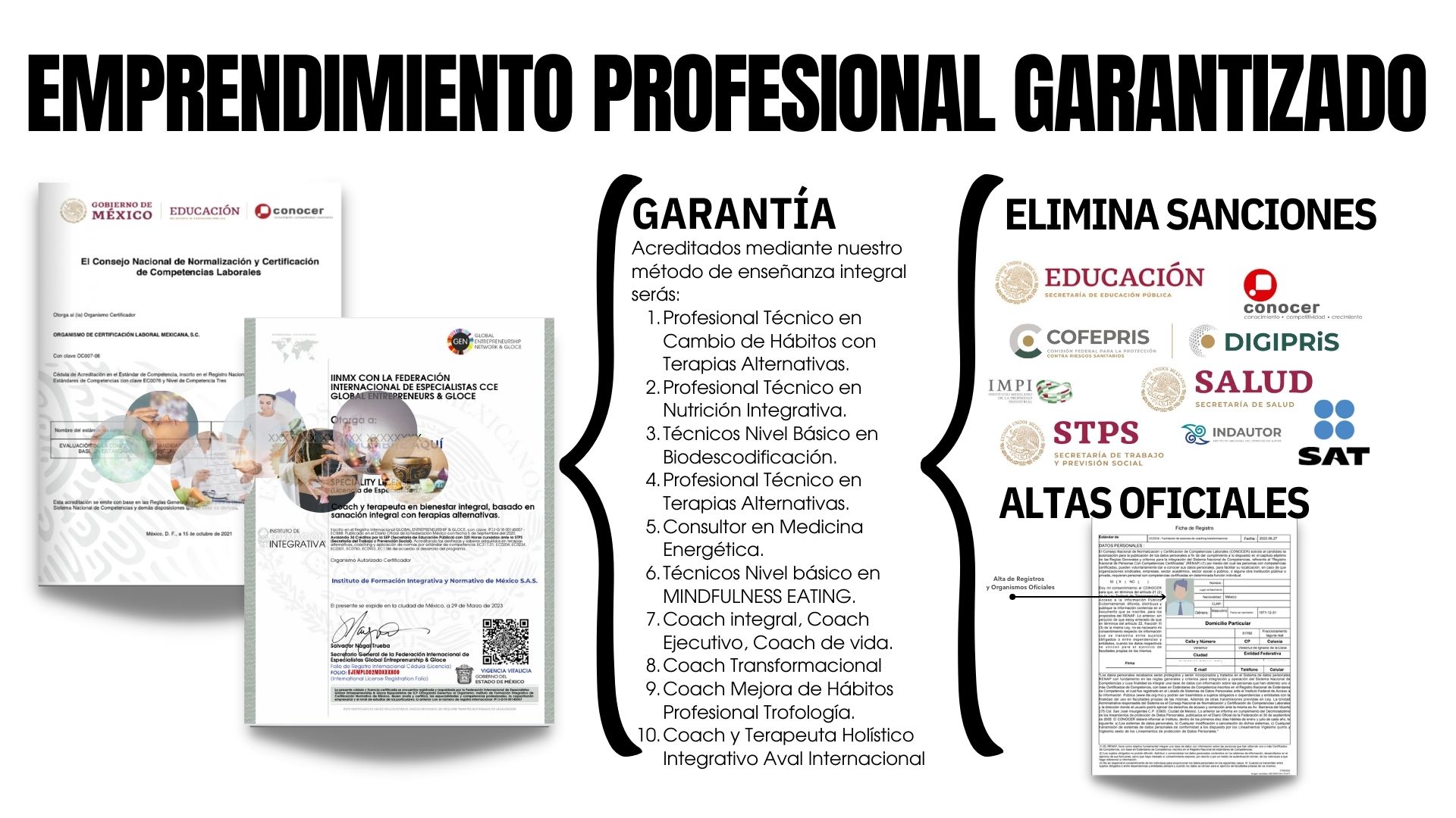 - Adquirirás la base y el conocimiento necesario sobre estrategias concretas para emprender y respaldarte como PROFESIONAL INTEGRATIVO, que avala tus conocimientos y emprendimientos a nivel nacional, que integra cédula, certificaciones y créditos, para emprender con seguridad ante cualquier instancia, ya sea pública o privada. Ademas de tener contactos por contactos de proveedores por servios permitiéndote multiplicar tus ganancias y resultados.