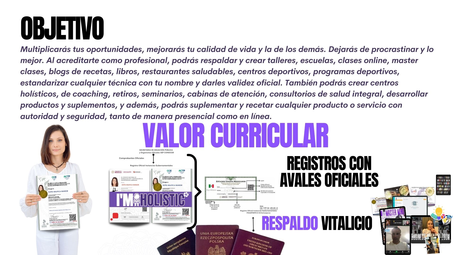 Además, obtendrás bases sólidas para ejercer con seguridad en múltiples oficios, podrás monetizar tu conocimiento y crear un modelo de negocio escalable, maximizando tus recursos y áreas de oportunidad. Todo respaldado por una acreditación oficial que integra certificaciones, créditos y reconocimientos nacionales e internacionales.